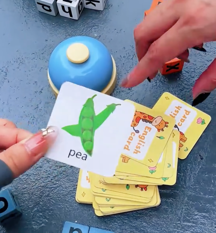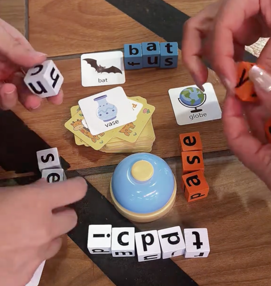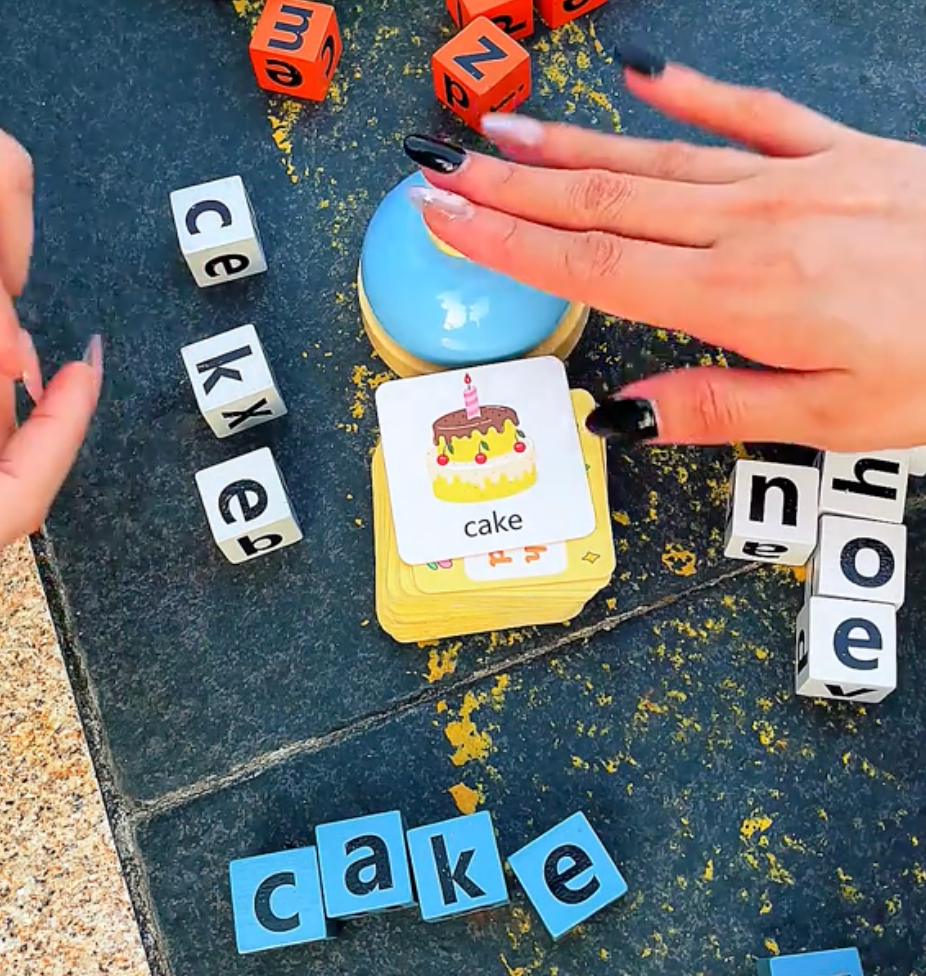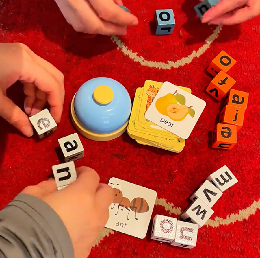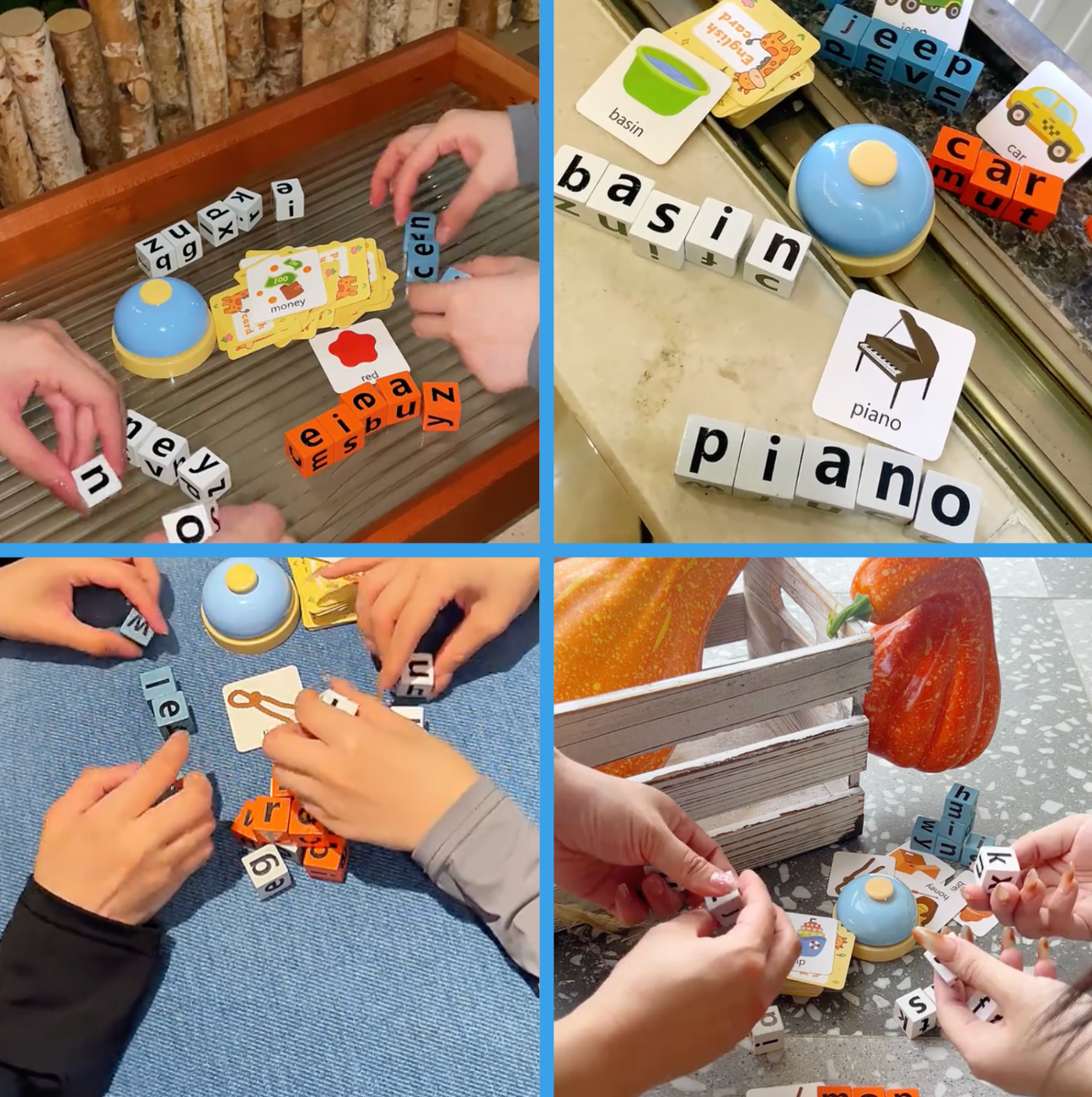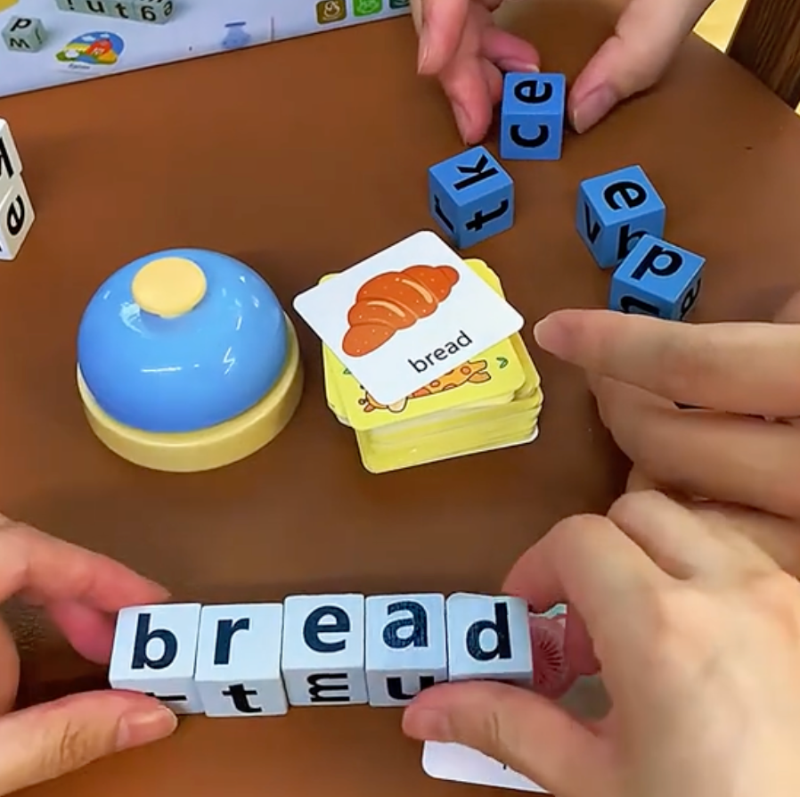 Players pick a card and use the wooden letters to spell the matching word. The player who rings the bell first after correctly spelling the word on card, wins!